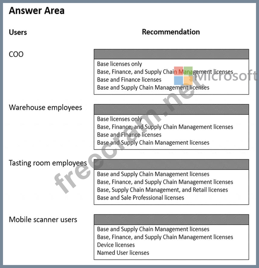 You need to recommend which type of Dynamics 365 licenses are needed.
