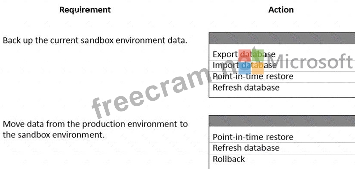 You can use Microsoft Dynamics Lifecycle Services (LCS) to perform a refresh of the database to a sandbox user acceptance testing (UAT) environment. A database refresh lets you copy the transactional and financial reporting databases of your production environment into the target, sandbox UAT environment. If you have another sandbox environment, you can also copy the databases from that environment to your target, sandbox UAT environment.