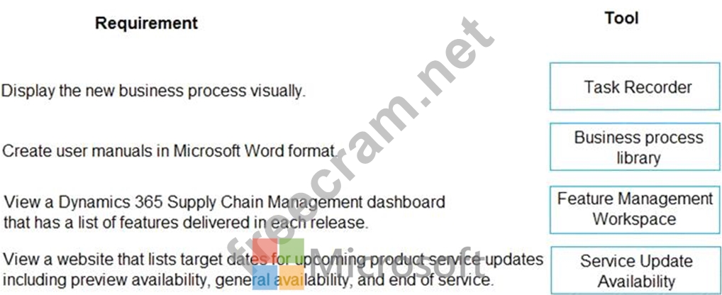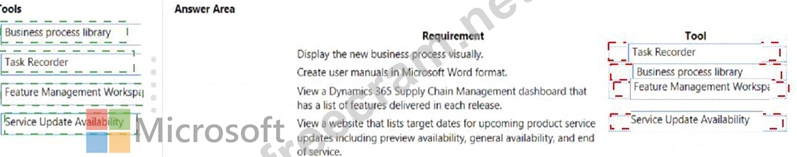 What should you recommend? To answer, drag the appropriate tools to the correct requirements. Each tool may be used once, more than once, or not at all. You may need to drag the split bar between panes or scroll to view content.