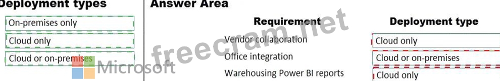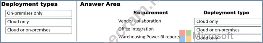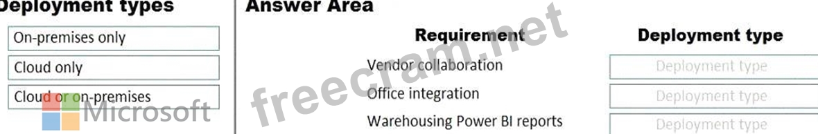 Which deployment type should you recommend? To answer, drag the appropriate deployment types to the correct requirements. Each deployment type may be used once, more than once, or not at all. You may need to drag the split bar between panes or scroll to view content.