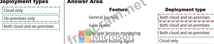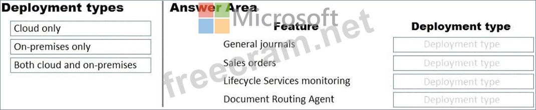What should you recommend? To answer, drag the appropriate deployment types to the correct features. Each deployment type may be used once, more than once, or not at all. You may need to drag the split bar between panes or scroll to view content.