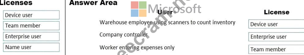Which type of license should you recommend? To answer, drag the appropriate licenses to the correct users.
