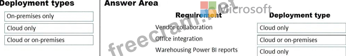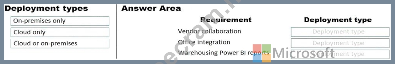 Which deployment type should you recommend? To answer, drag the appropriate deployment types to the correct requirements. Each deployment type may be used once, more than once, or not at all. You may need to drag the split bar between panes or scroll to view content.