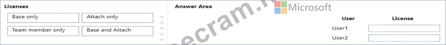 What should you recommend? To answer, drag the appropriate licenses to the correct users. Each license may be used once, more than once, or not at all. You may need to drag the split bar between panes or scroll to view content.