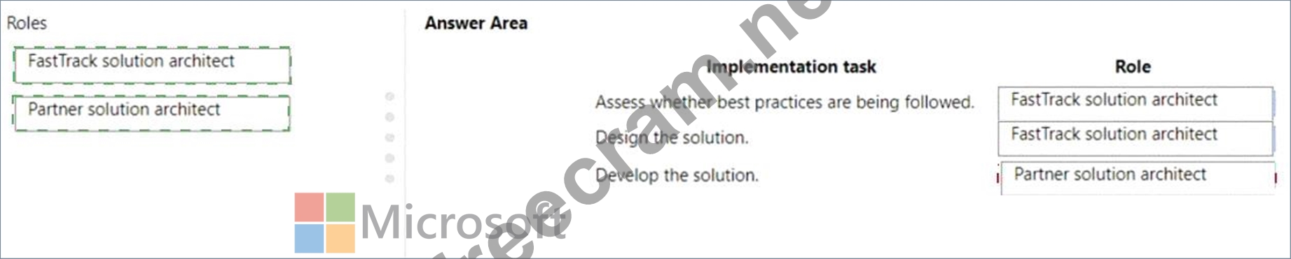 Which role is responsible for each implementation task? To answer, drag the appropriate roles to the correct implementation tasks. Each role may be used once, more than once, or not at all. You may need to drag the split bar between panes or scroll to view content.