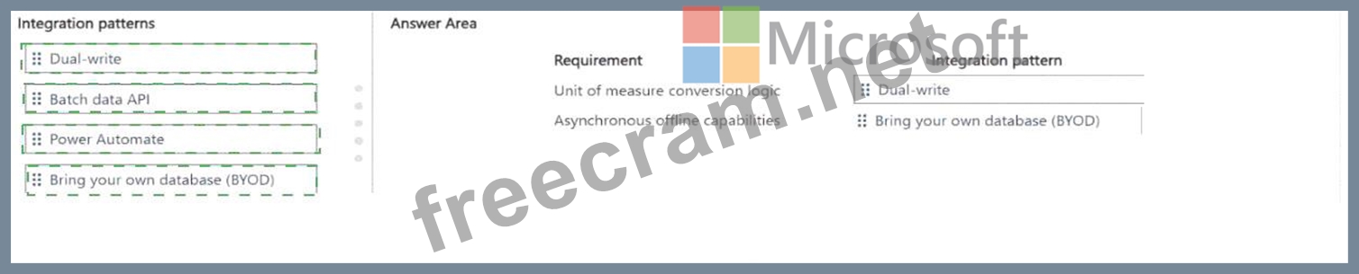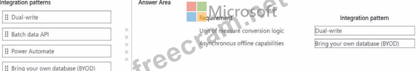 Which integration patterns should you recommend? To answer, drag the appropriate integration patterns to the correct requirements. Each integration pattern may be used once, more than once, or not at all. You may need to drag the split bar between panes or scroll to view content.