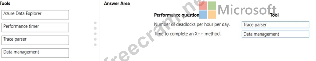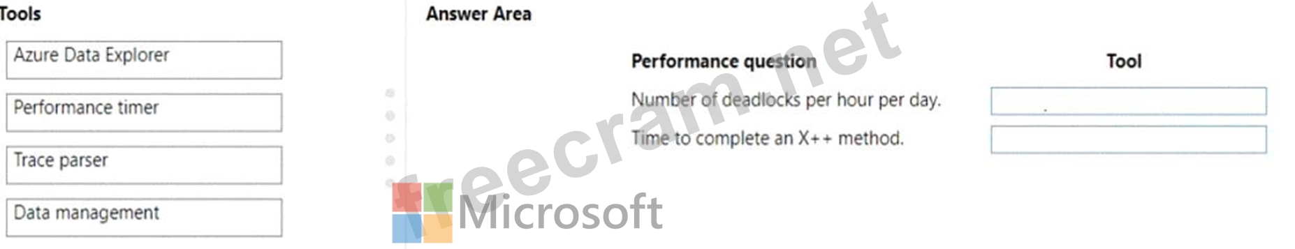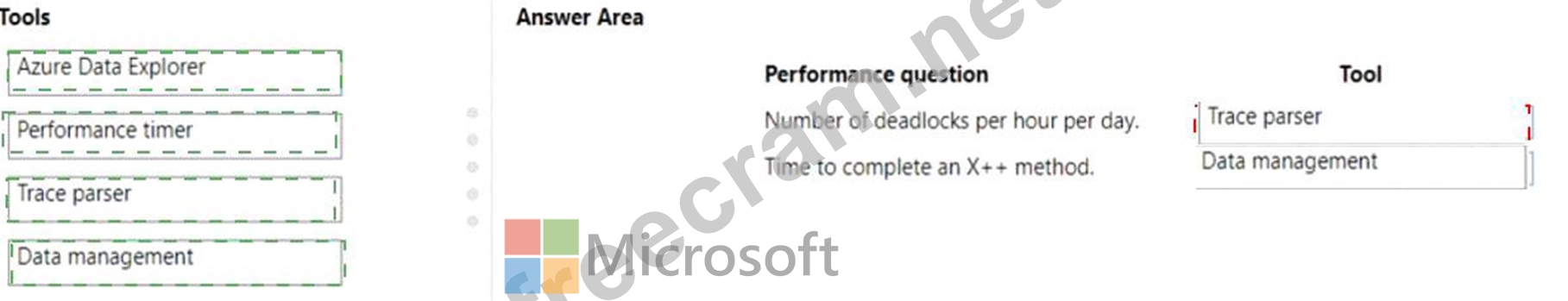 Which tools should you recommend? To answer, drag the appropriate tools to the correct performance questions. Each tool may be used once, more than once, or not at all. You may need to drag the split bar between panes or scroll to view content.