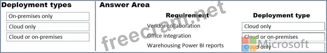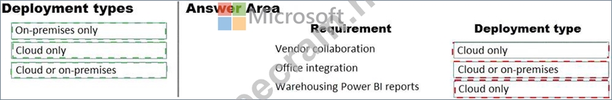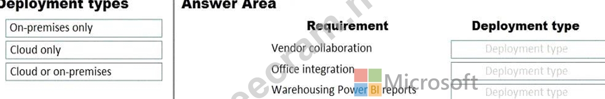 Which deployment type should you recommend? To answer, drag the appropriate deployment types to the correct requirements. Each deployment type may be used once, more than once, or not at all. You may need to drag the split bar between panes or scroll to view content.