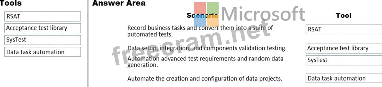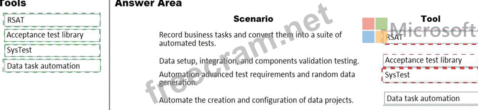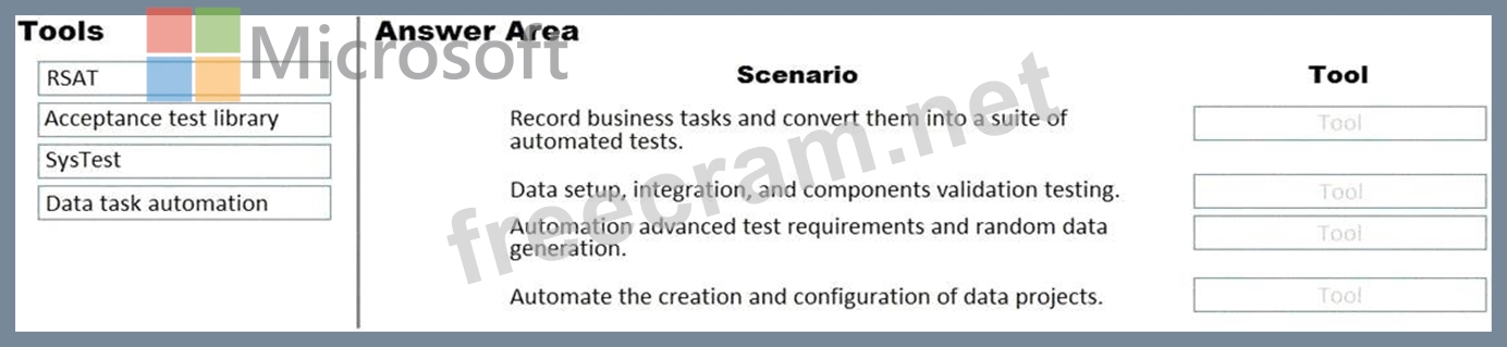 What should you recommend? To answer, drag the appropriate tools to the correct scenarios. Each tool may be used once, more than once, or not at all. You may need to drag the split bar between panes or scroll to view content.