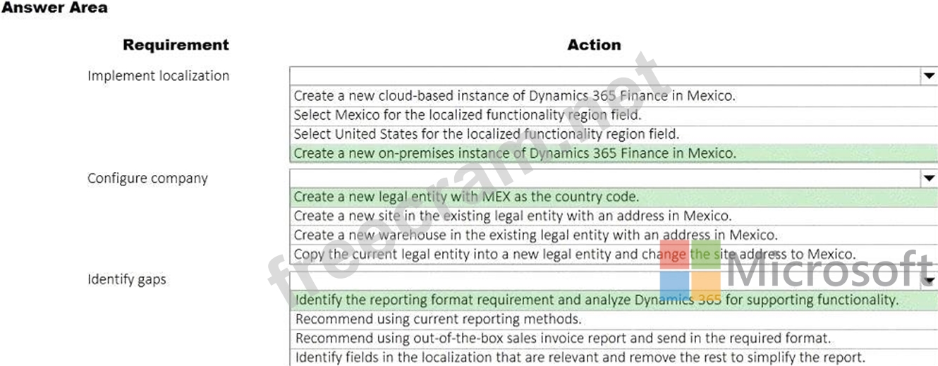 You need to recommend a solution that meets Mexican localization reporting requirements. What should you recommend? To answer, select the appropriate options in the answer area. NOTE: Each correct selection is worth one point.