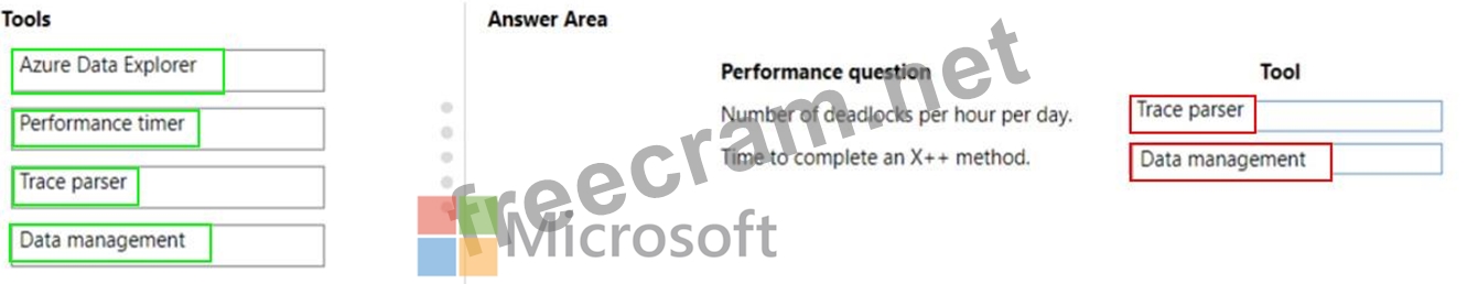 Which tools should you recommend? To answer, drag the appropriate tools to the correct performance questions. Each tool may be used once, more than once, or not at all. You may need to drag the split bar between panes or scroll to view content.
