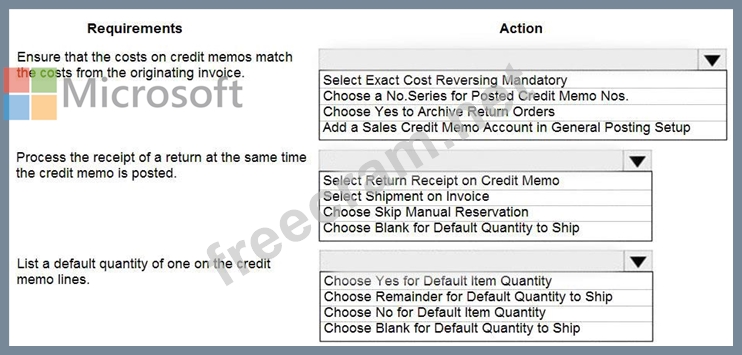 A company uses Dynamics 365 Business Central. The company wants to automate sales credit memo processing. You need to configure the system to meet the requirements. What should you do? To answer, select the appropriate options in the answer area. NOTE: Each correct selection is worth one point.