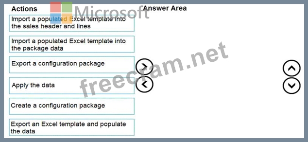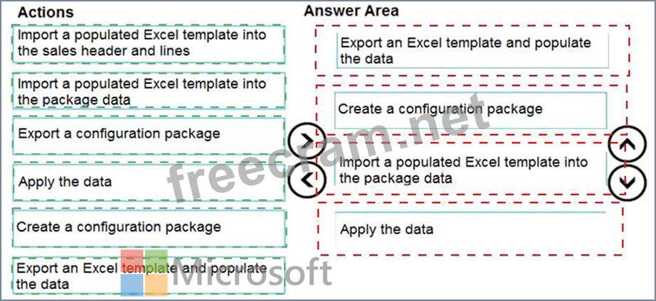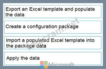 You set up a new company for a customer. The customer provides you with a Microsoft Excel file that contains master data. You need to import the master data by using configuration packages. Which four actions should you perform in sequence? To answer, move the appropriate actions from the list of actions to the answer area and arrange them in the correct order.