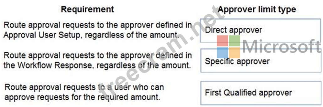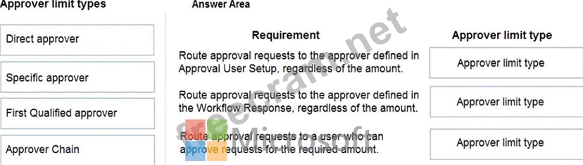 You are setting up approval workflows in Dynamics 365 Business Central. You need to configure approval limits. Which approver limit types should you use? To answer, drag the appropriate approver limit types to the correct requirements. Each approver limit type may be used once, or not at all. You may need to drag the split bar between panes or scroll to view content. NOTE: Each correct selection is worth one point.