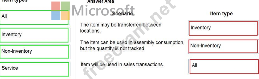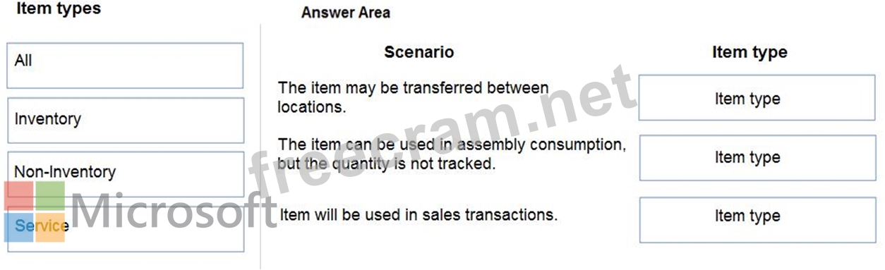 Which item types should you use? To answer, drag the appropriate item types to the correct scenarios. Each item type may be used once, more than once, or not at all. You may need to drag the split bar between panes or scroll to view content.