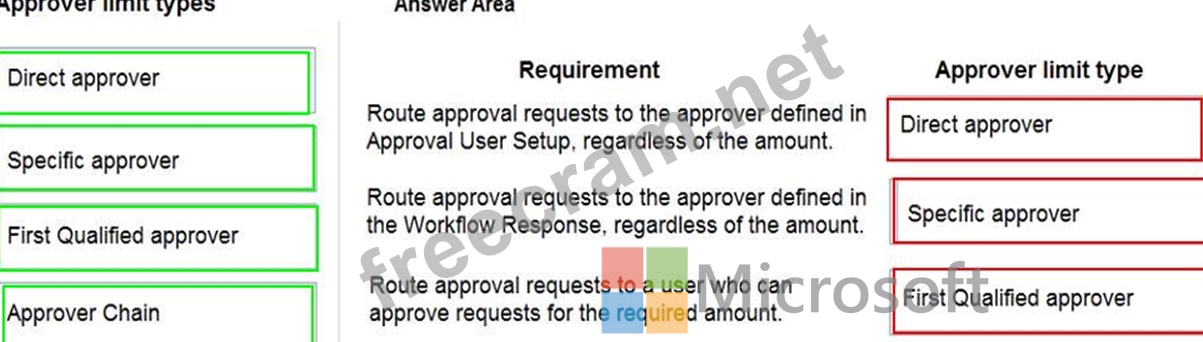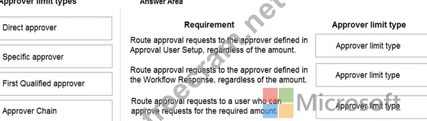 Which approver limit types should you use? To answer, drag the appropriate approver limit types to the correct requirements. Each approver limit type may be used once, or not at all. You may need to drag the split bar between panes or scroll to view content.