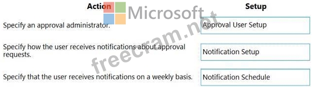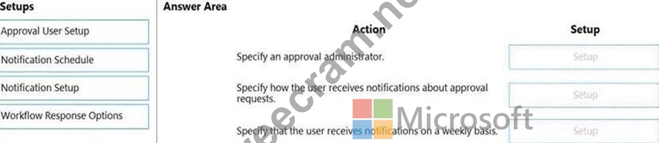 Which setup should you use? To answer, drag the appropriate setup to the correct actions. Each setup may be used once, more than once, or not at all. You may need to drag the split bar between panes or scroll to view content.