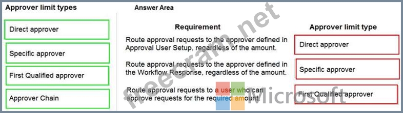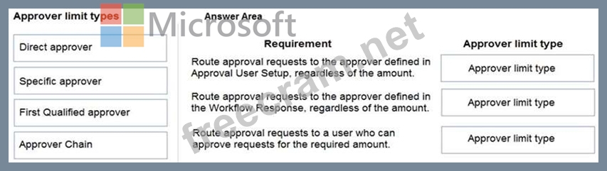 Which approver limit types should you use? To answer, drag the appropriate approver limit types to the correct requirements. Each approver limit type may be used once, or not at all. You may need to drag the split bar between panes or scroll to view content.