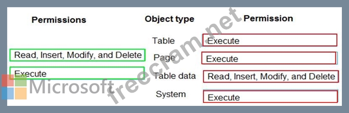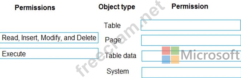 Which permission or set of permissions is allowed for each type of object? To answer, drag the appropriate permissions to the correct object types. Each permission set may be used once, more than once, or not at all. You may need to drag the split bar between panes or scroll to view content.