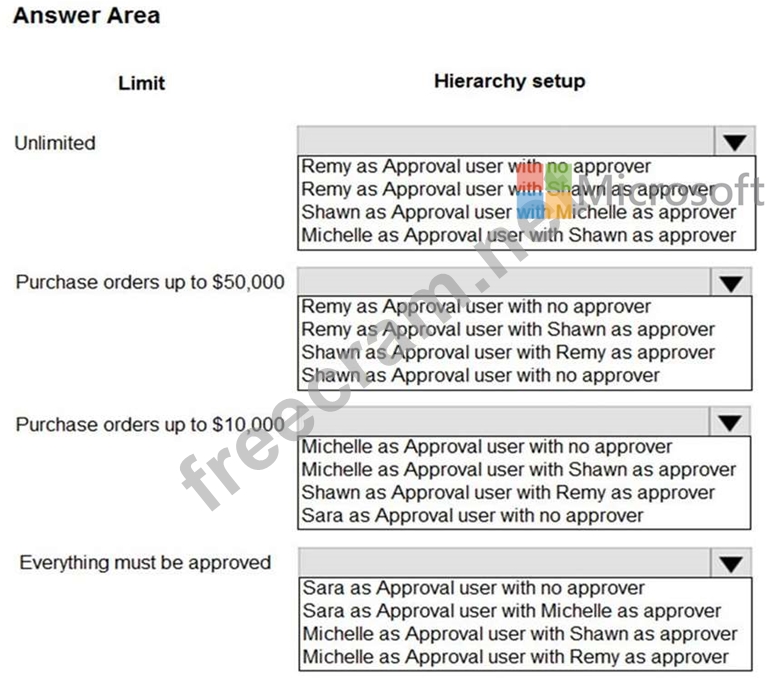 The accounting manager wants to set up a complete Purchase Document Approval system with an approval hierarchy that meets the following requirements: