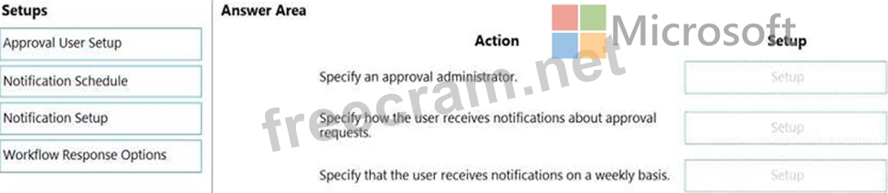 Which setup should you use? To answer, drag the appropriate setup to the correct actions. Each setup may be used once, more than once, or not at all. You may need to drag the split bar between panes or scroll to view content.