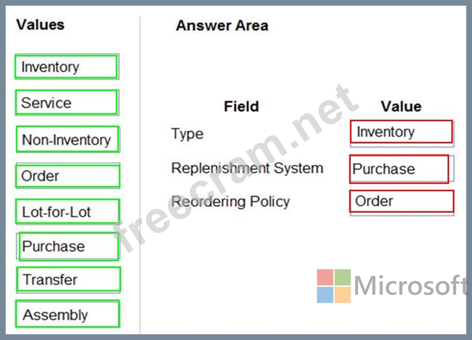 How should you configure each field? To answer, drag the appropriate values to the correct fields. Each value may be used once, more than once, or not at all. You may need to drag the split bar between panes or scroll to view content.