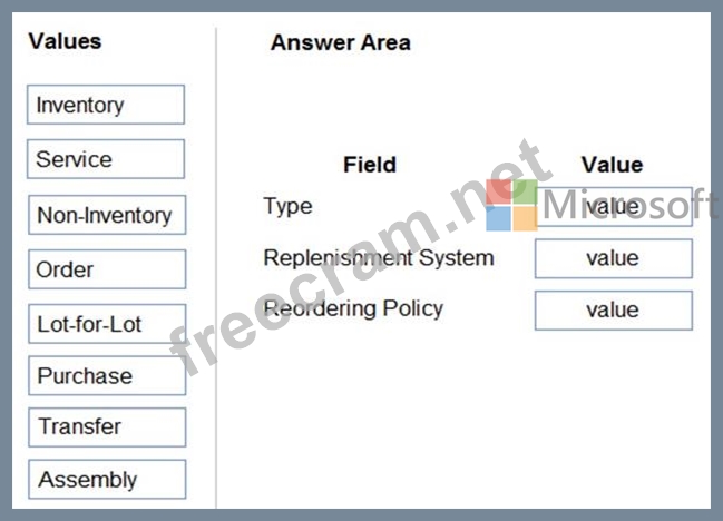 How should you configure each field? To answer, drag the appropriate values to the correct fields. Each value may be used once, more than once, or not at all. You may need to drag the split bar between panes or scroll to view content.