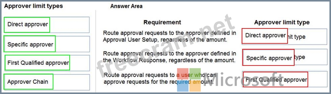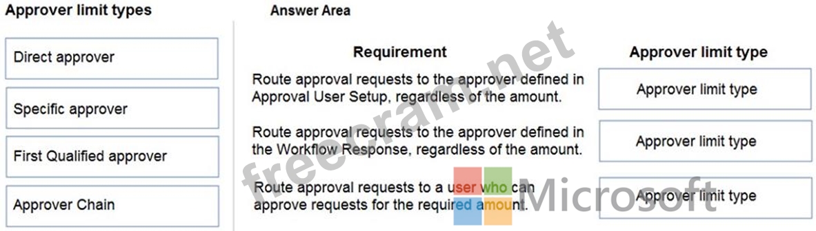 Which approver limit types should you use? To answer, drag the appropriate approver limit types to the correct requirements. Each approver limit type may be used once, or not at all. You may need to drag the split bar between panes or scroll to view content.