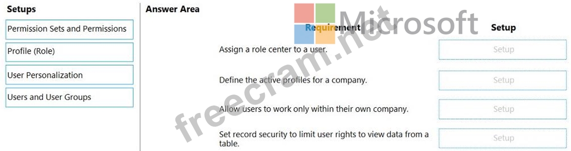 Which setup should you use? To answer, drag the appropriate setups to the correct requirements. Each setup may be used once, more than once, or not at all. You may need to drag the split bar between panes or scroll to view content.