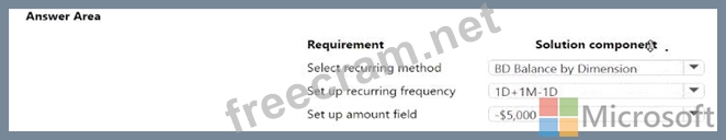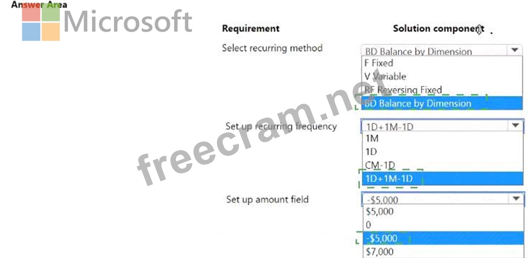 You need to configure the system to automatically allocate building expense total balances each month between dimensions. How should you configure recurring general journals? To answer, select the appropriate options in the answer area. NOTE: Each correct selection is worth one point.