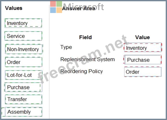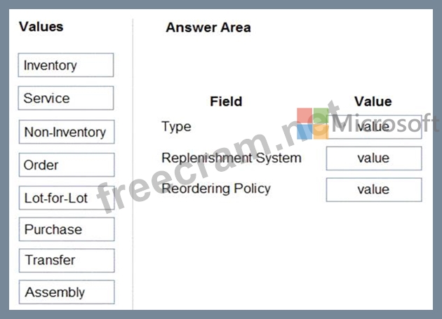How should you configure each field? To answer, drag the appropriate values to the correct fields. Each value may be used once, more than once, or not at all. You may need to drag the split bar between panes or scroll to view content.