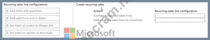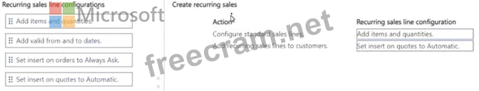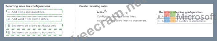 How should you complete each action? To answer, move the appropriate recurring sales line configurations to the correct actions. You may use each recurring sales line configuration once, more than once, or not at all.
