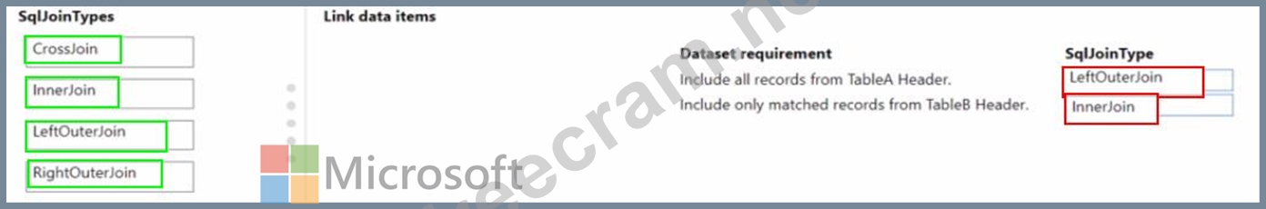 Which SqlJoinType should you use? To answer, move the appropriate SqUoinTypes to the correct dataset requirements. You may use each SqlJoinType once, more than once, or not at all. You may need to move the split bar between panes or scroll to view content.