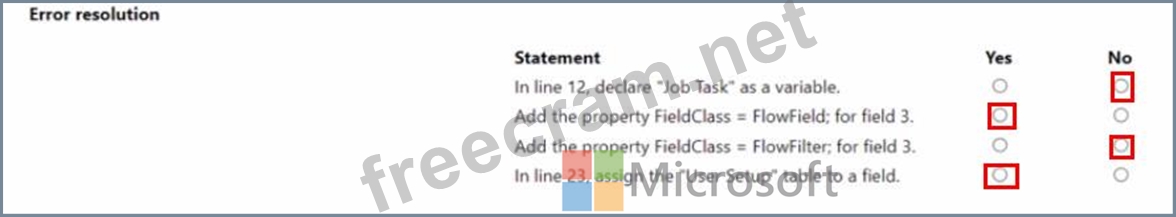 You create a table with fields. You observe errors in the code You need to resolve the errors. For each of the following statements, select Yes if the statement is true. Otherwise, select No. NOTE: Each correct selection is worth one point.