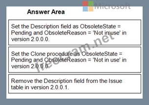 1 - Set the Description field as ObsoleteState = Pending and ObsoleteReason = 'Not in use' in version 2.0.0.0. 2 - Set the Clone procedure as ObsoleteState = Pending and ObsoleteReason = 'Not in use' in version 2.0.0.0. 3 - Remove the Description field from the Issue table in version 2.0.0.1.