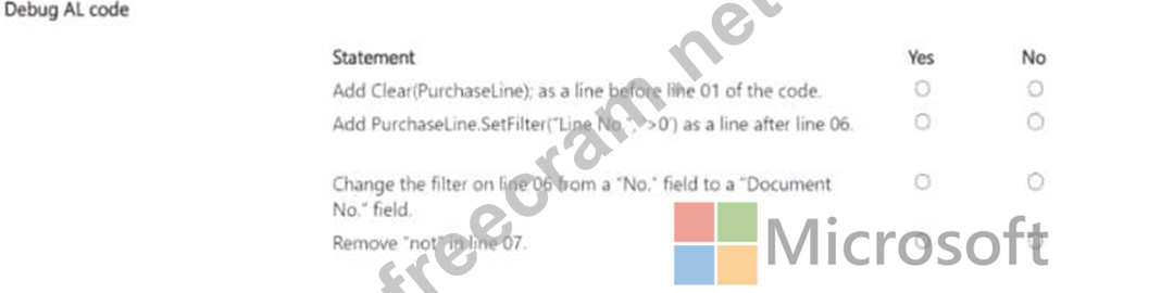 Add PurchaseLine.SetFilter("Line No."; '>0') as a line after line 06: Yes Change the filter on line 06 from a "No." field to a "Document No." field: No Remove "not" in line 07: No Add Clear(PurchaseLine); as a line before line 01 of the code.