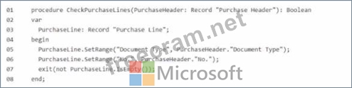 * The not in line 07 is necessary because IsEmpty() returns true when no lines are found. To correctly return a boolean indicating whether the purchase order has lines, you need to negate the result of IsEmpty().