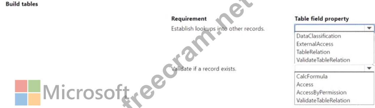 * TableRelation Property:This property is used to create a relationship between the field in one table and a field in another table, which is typically used for lookups. When you set the TableRelation property on a field, it allows users to select from a list of values that exist in the related table.