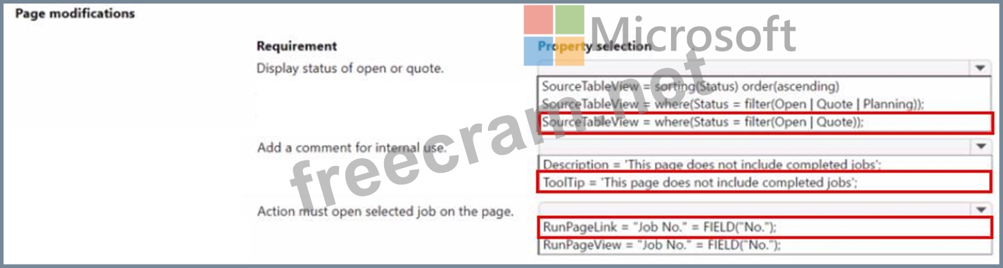 A company has a page named New Job Status connected to a source table named Job. The page has an action named Item Ledger Entries. The company requires the following changes to the page: