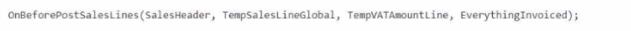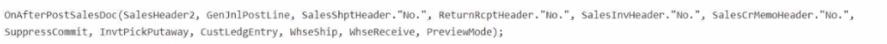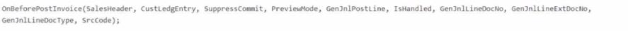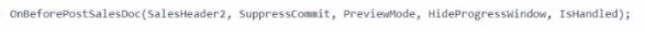 This event occurs before posting a sales document. PreviewMode is available in the parameters, which allows checking whether the process is being run in preview mode. This event is typically used for sales order posting and can be used for both shipping and invoicing. This event matches the requirements because: You can check if PreviewMode is false. It can run for both shipping and invoicing.