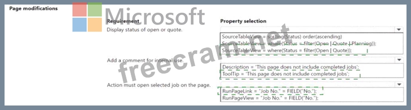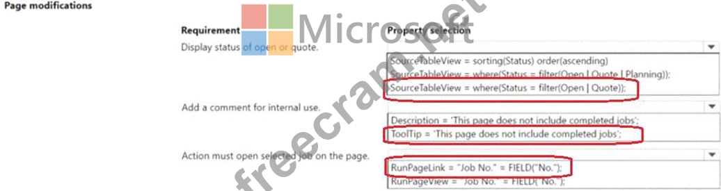 A company has a page named New Job Status connected to a source table named Job. The page has an action named Item Ledger Entries. The company requires the following changes to the page:
