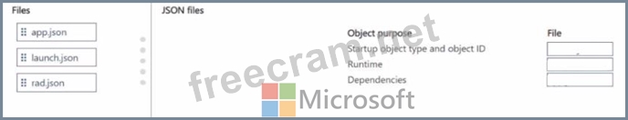 You need to configure the JSON file for the specified parameters and properties Which JSON files should you configure? To answer, move the appropriate files to the correct object purposes You may use each file once, more than once, or not at all You may need to move the split bar between panes or scroll to view content NOTE Each correct selection is worth one point.