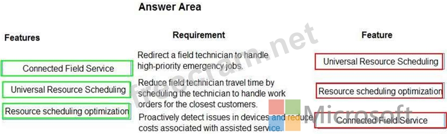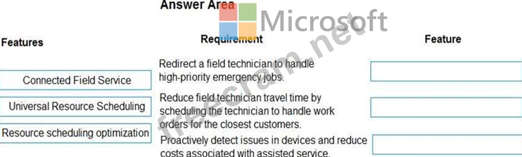 You need to recommend appropriate features of Dynamics 365 Field Service to meet the requirements. Which feature should you recommend? To answer, drag the appropriate features to the correct requirements.