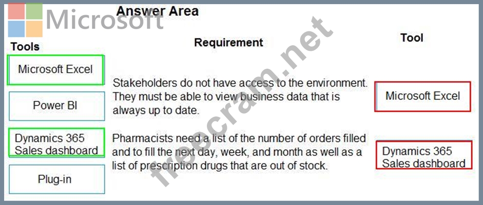 You are designing reports for a pharmacy. The pharmacy uses Dynamics 365 Sales. Match each tool to the reporting requirements. Instructions: To answer, drag the appropriate tool from the column on the left to the requirements on the right. Each tool may be used once, more than once, or not at all. NOTE: Each correct match is worth one point.