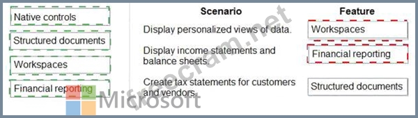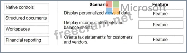 A company implements Dynamics 365 Finance. You need to recommend features that the company can use for integrated reporting scenarios. Which feature should you recommend? To answer, drag the appropriate features to the correct scenarios. Each feature may be used once, more than once, or not at all. You may need to drag the split bar between panes or scroll to view content. NOTE: Each correct selection is worth one point.