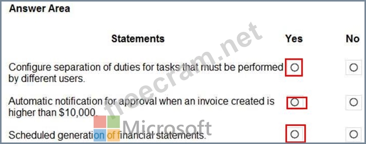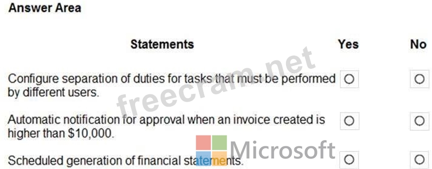 Question 101: A company uses Dynamics 36S Finance. For each of the followi...