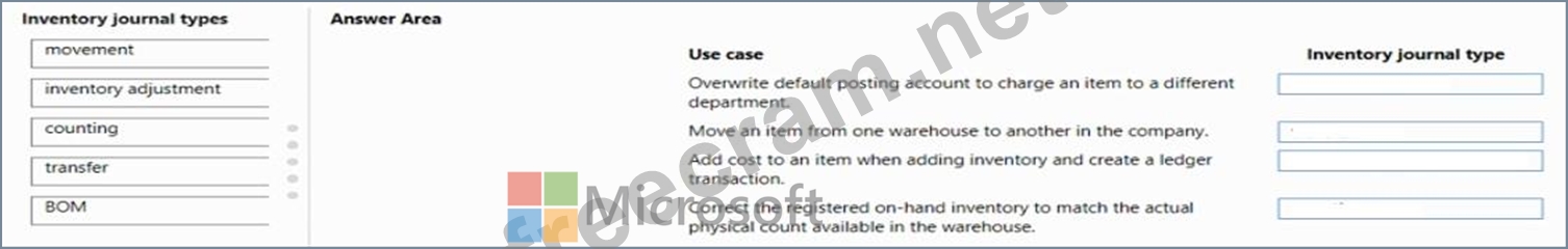 Match each type of inventory journal to its use case. To answer, drag the appropriate type of inventory journal from the column on the left to its use case on the right. Each type of inventory journal may be used once, more than once, or not at all.