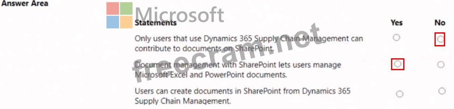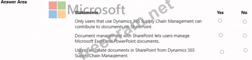 A company implements Dynamics 365 Supply Chain Management. The company uses Microsoft SharePoint Online for document management. For each of the following statements, select Yes if the statement is true. Otherwise, select No. NOTE: Each correct selection is worth one point.