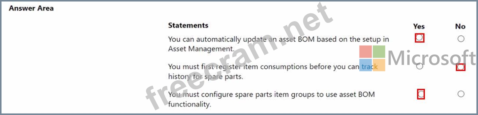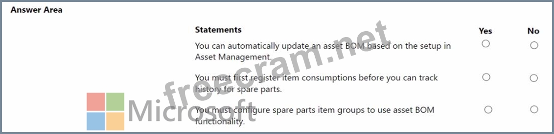 A company uses Dynamics 365 Supply Chain Management. The company plans to implement asset bill of materials (BOMs) to manage spare parts.