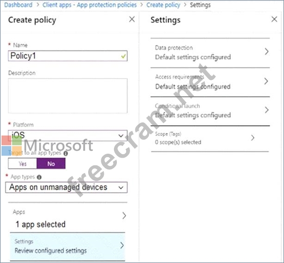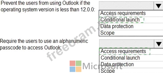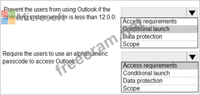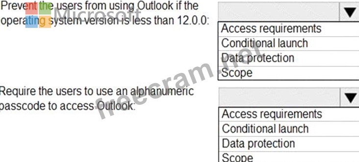 What should you configure in an app protection policy for each requirement? To answer, select the appropriate options in the answer area.